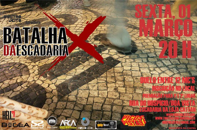 No dia 01 de março acontece mais uma edição da Batalha da Escadaria. A proposta é a realização de um duelo entre MCs com à improvisação poética no estilo freestyle, estilo livre de rimar.